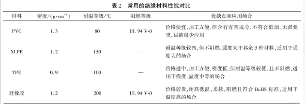 電動汽車內(nèi)部環(huán)境復(fù)雜,在選用絕緣材料時,一方面要保障好絕緣層的安全使用,另一方面盡可能選擇易加工和使用廣泛的材料。目前常用的絕緣材料有聚氯乙烯(PVC)、交聯(lián)聚乙烯(XLPE)、硅橡膠、熱塑性彈性體(TPE)等,其主要性能見表2。