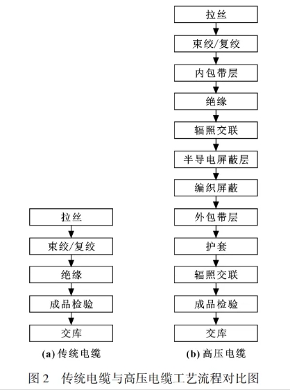 目前,電動汽車用高壓電纜的發(fā)展迅速,對應(yīng)的成型工藝也與傳統(tǒng)電纜的成型工藝大有不同,兩種工藝流程對比如圖2所示。