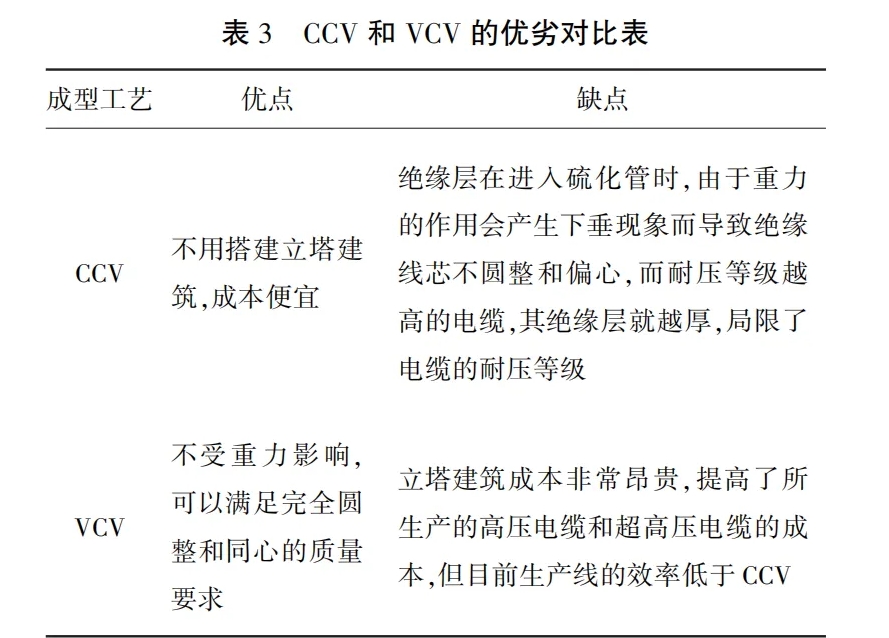 對于高壓XLPE電纜的生產(chǎn)基本采用懸鏈?zhǔn)礁煞ń宦?lián)(CCV)和立塔式干法交聯(lián)(VCV)兩種成型工藝,實際上兩種工藝生產(chǎn)的電纜都存在交聯(lián)不充分等問題,會在絕緣層留有部分交聯(lián)副產(chǎn)物,對電纜的性能都有一定的影響,表3為兩種工藝的優(yōu)劣對比。